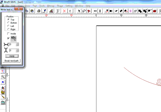 4. Klik derefter på ”Apply”, teksten bliver nu sat sammen med buen. For at fjerne buen skal du klikke på ”Break text/path” og markere buen for at derefter at slette denne.