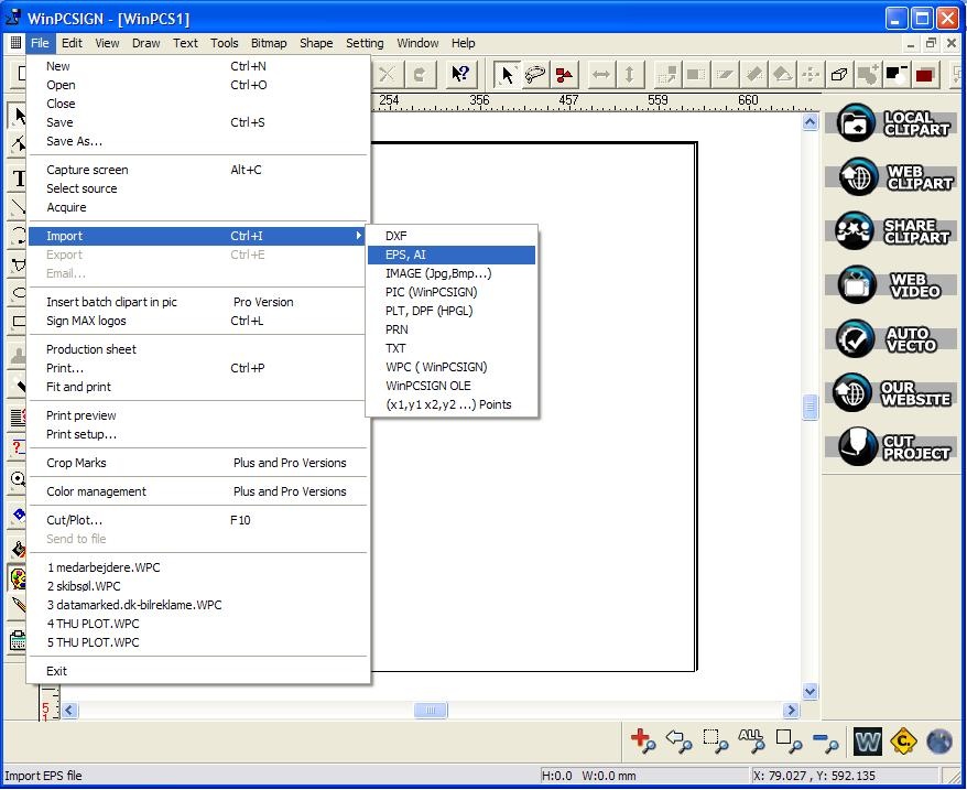 Når i bruger vectorfilerne (clipartene) fra ex. hotflames clipart skive, skal i blot sætte skiven i maskinen, gå ind i WinPCSIGN, vælge menuen ”File” og vælg menupunktet ”Import” , derefter ”EPS, AI” og så skal i finde filerne i vil bruge på cd’en og de vil så blive importeret