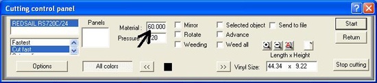 - Flyt folien helt ud til højre side(1cm fra kanten) og genstart maskinen samt tryk på pil op, så sætter den nulpunktet i højre side