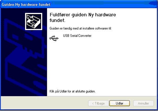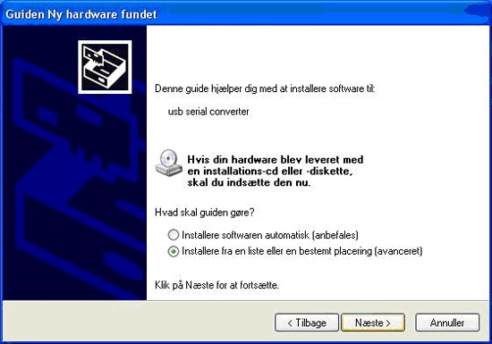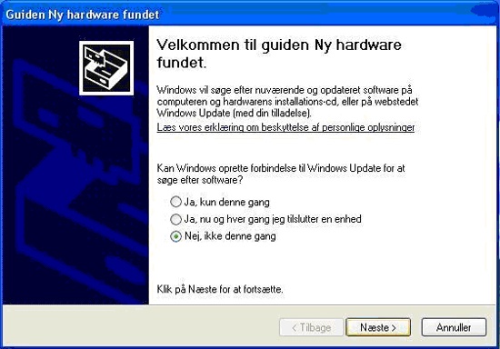 Se demonstrationsvideoen eller følg installations guide nedenunder videoen for installation af USB til SERIAL adaptor1. Når USB kabel er forbundet til computer fremkommer følgende billede da driveren skal installeres før adapteren virker. Vælg ”Nej, ikke denne gang” og tryk ”Næste”.