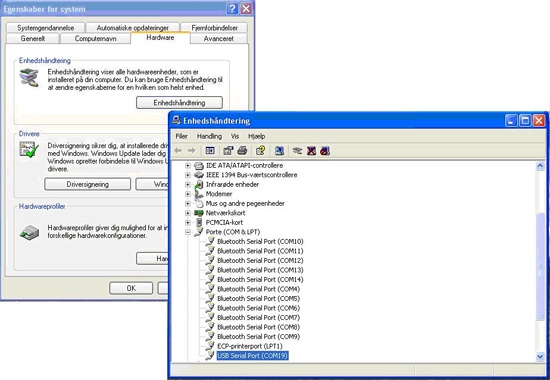 1. Klik på ”Denne computer/My computer” og vælg ”Egenskaber” samt ”Hardware” og ”Enhedshåndtering”. Du kan nu se nedenstående skærm ved at klikke på krydset ved ”Porte”
