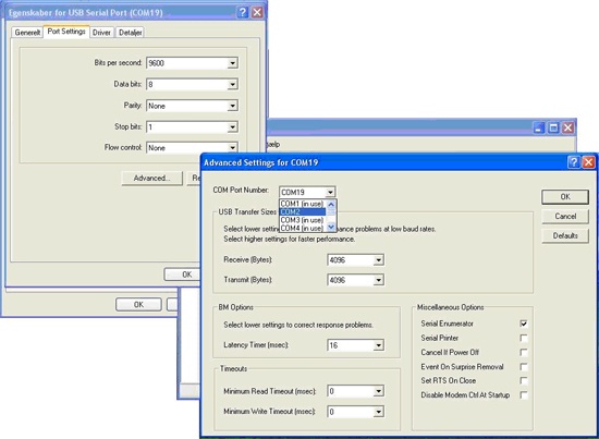 2. Vælg den Com-port som du har installeret USB Adaptoren til at være. I dette tilfælde vælges COM2.
